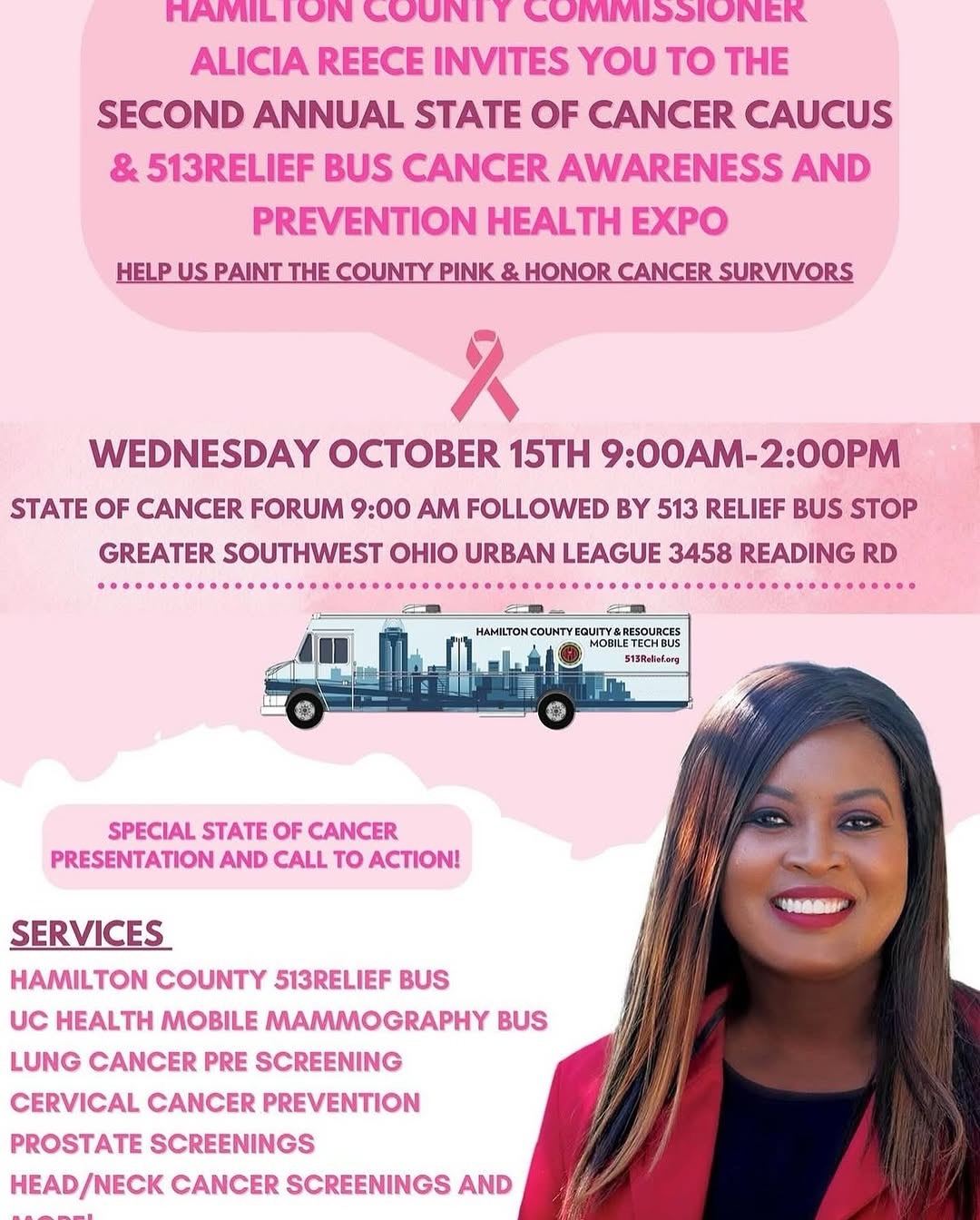 Hamilton County Commissioner Alicia Reece is calling the community to action for an important cause — the Second Annual State of Cancer Caucus & 513Relief Bus Cancer Awareness and Prevention Health Expo.