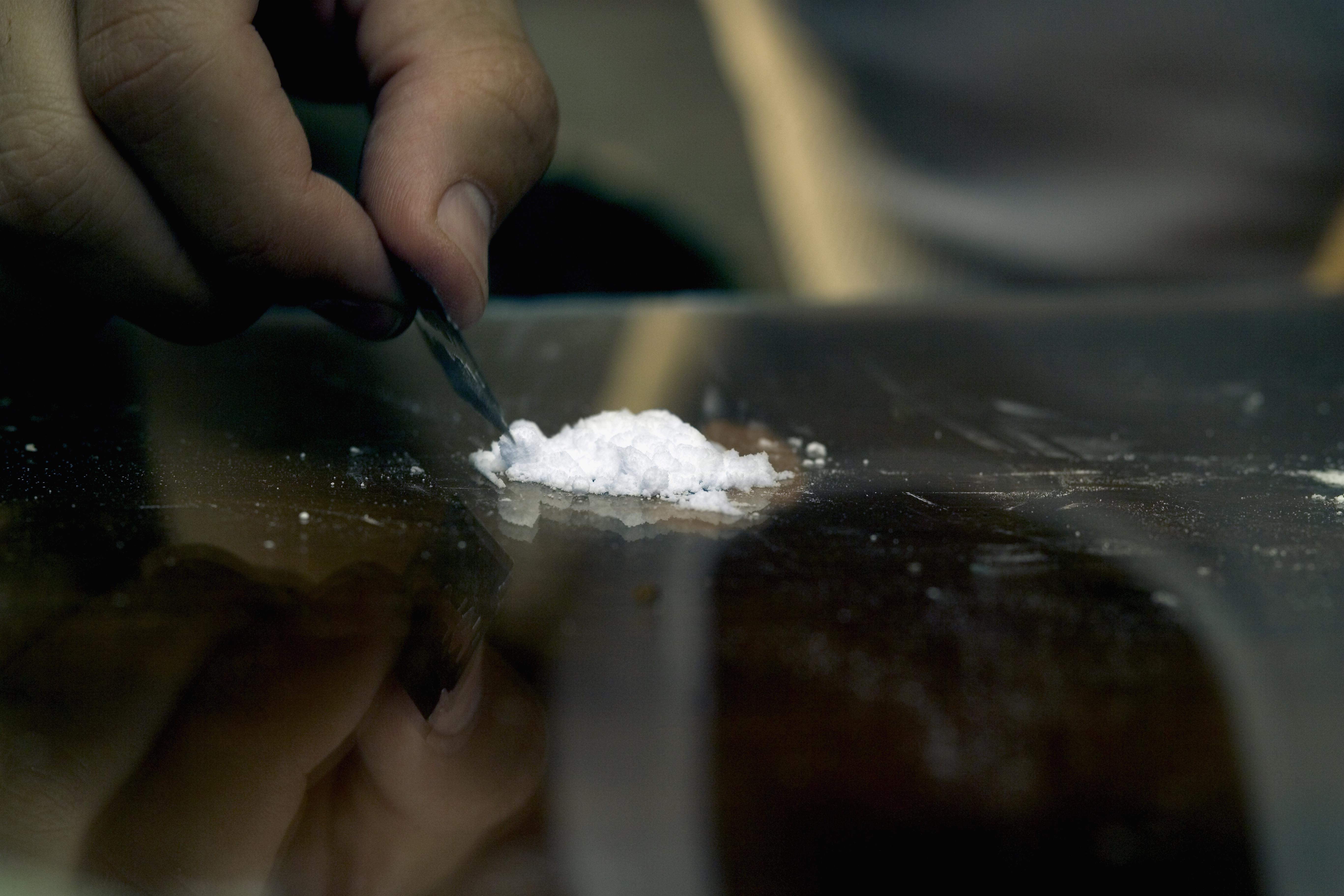 Close-up of a man's hand cutting cocaine with a blade